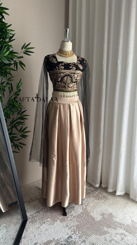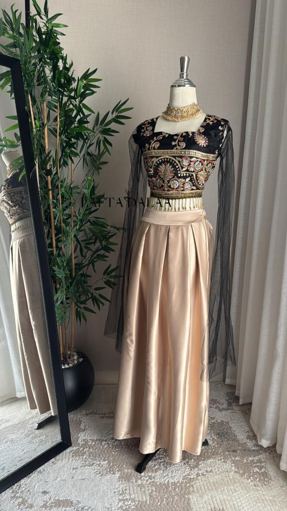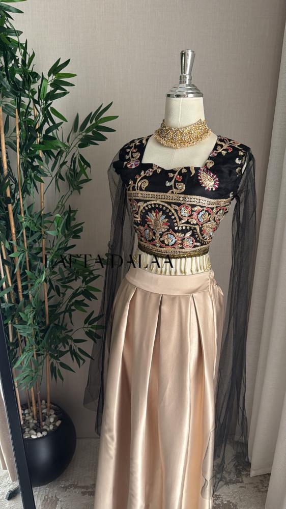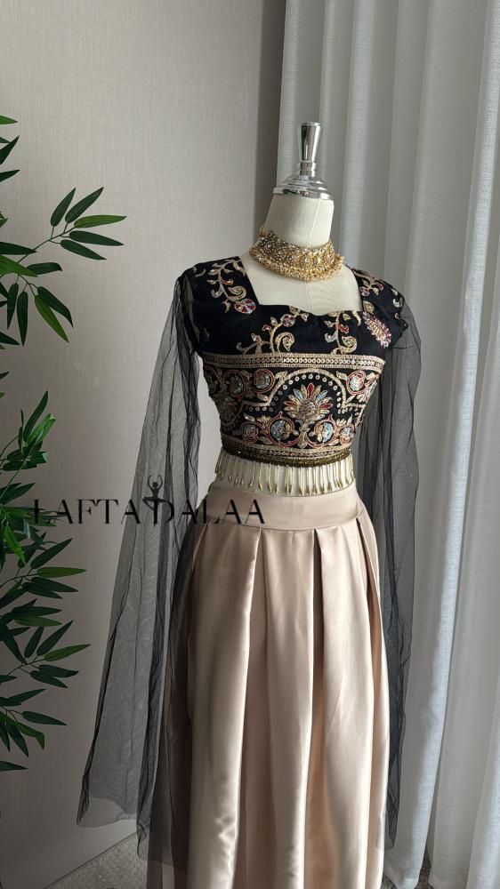 - الجزء العلوي: مصنوع من قماش أسود شفاف مع أكمام طويلة من التول الناعم، ومطرز بتطريزات ذهبية وزهرية ملونة تعطي لمسة ملكية مميزة.